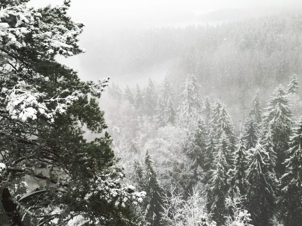 The travel to the top was slippery. This is why we had to be careful when walking. At the top we finally made it to the viewpoint from which we saw a beautiful silent scenery. I did not have my camera with me but my phone surprised me positively and took almost DSLR worthy photos. The cold weather, falling snow, mist and silence made the scenery look almost poetic.