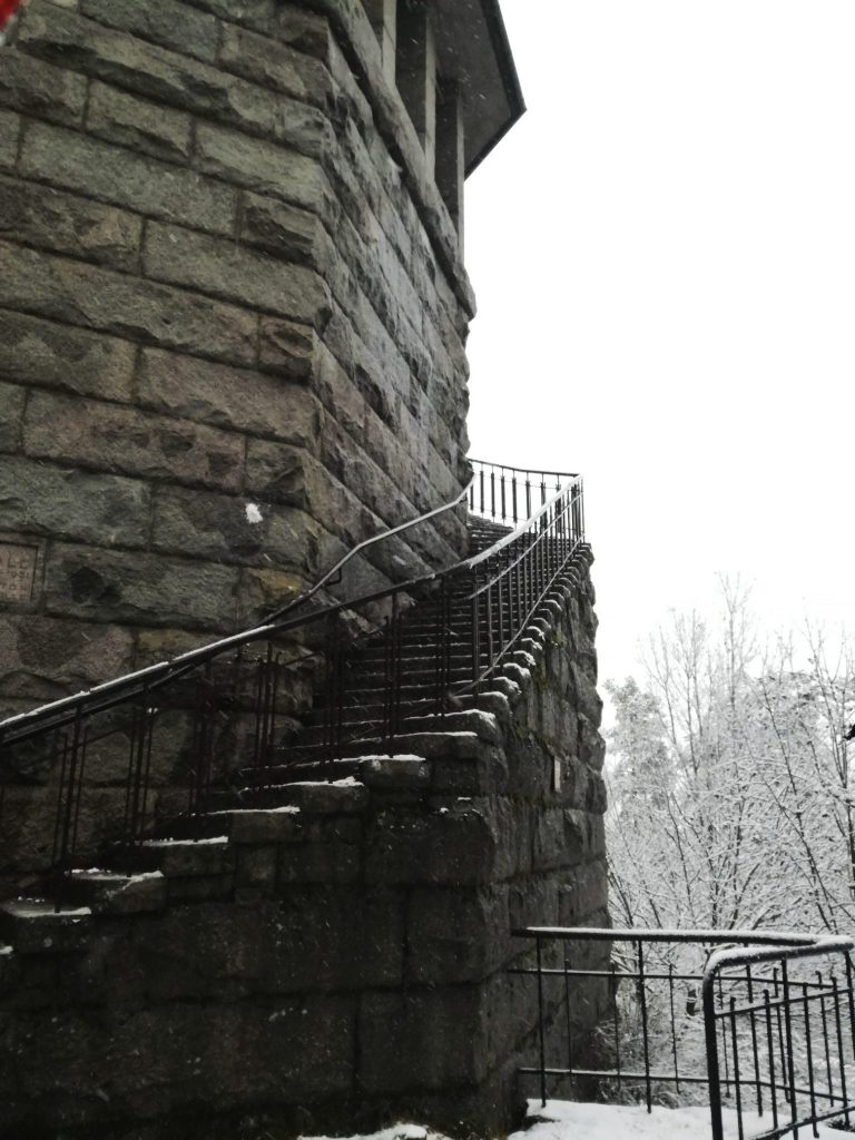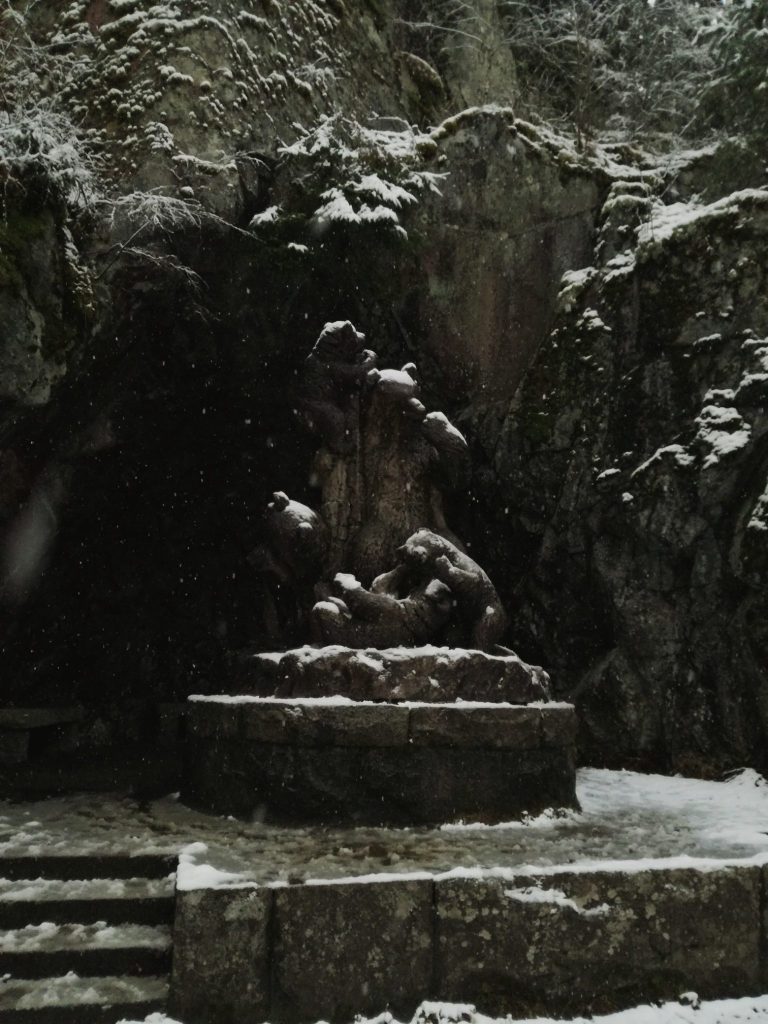 On the top of the hill there was a view tower which did not show much due to the thick mist. The steps to the tower are made from stone which gave a nice little added excitement for the walk as the steps were very slippery. Gladly there were only a few steps so the walk was not too bad. The more terrifying steps were next to the view point which led all the way down the side of the cliff. The icy, wet and slippery steps were quite tough to walk so if one was wearing bad shoes that walk down might not be worth the risk. At the bottom you can though admire a Bear statue and go behind it and giggle at the echo of the cliff.